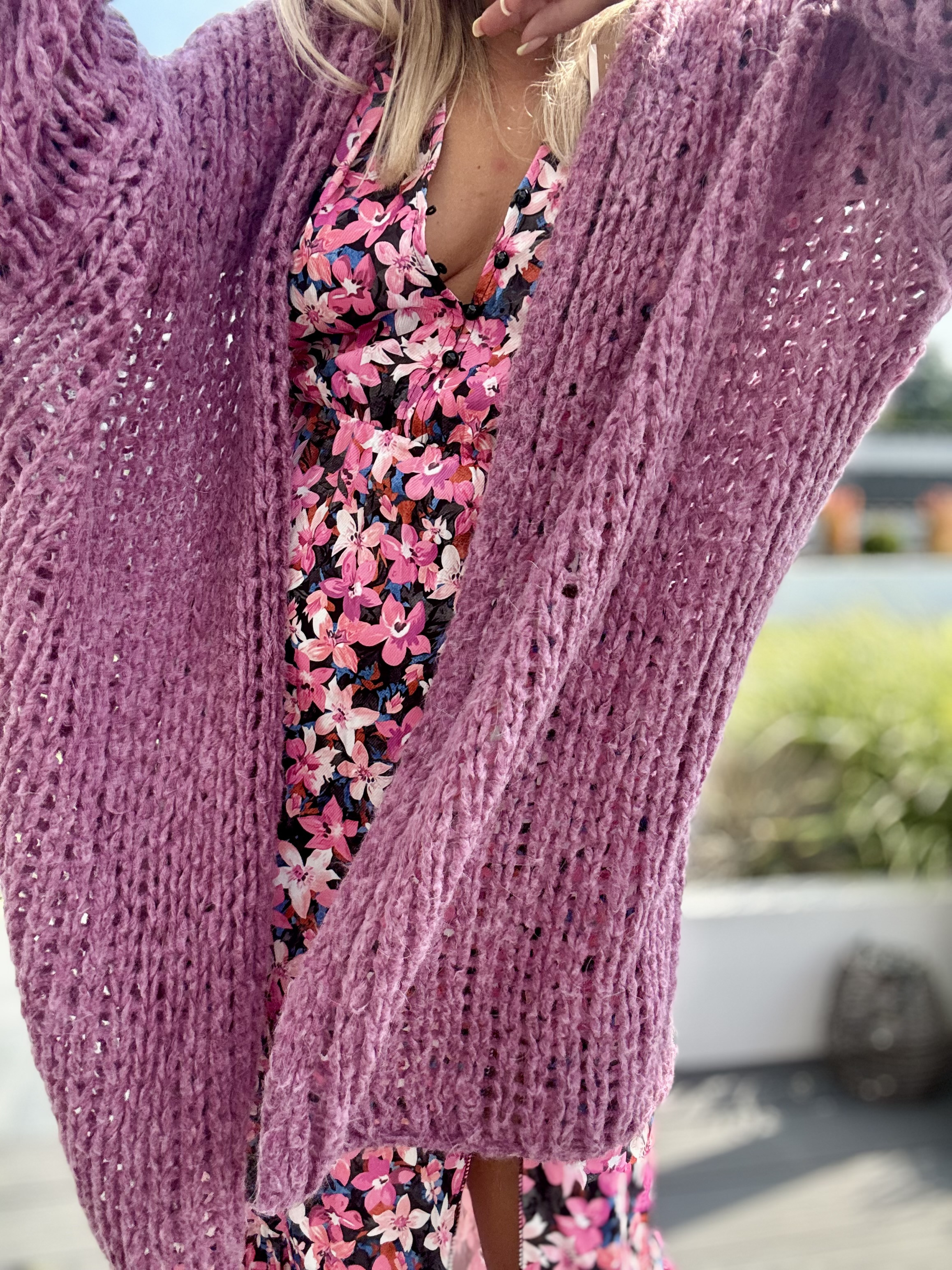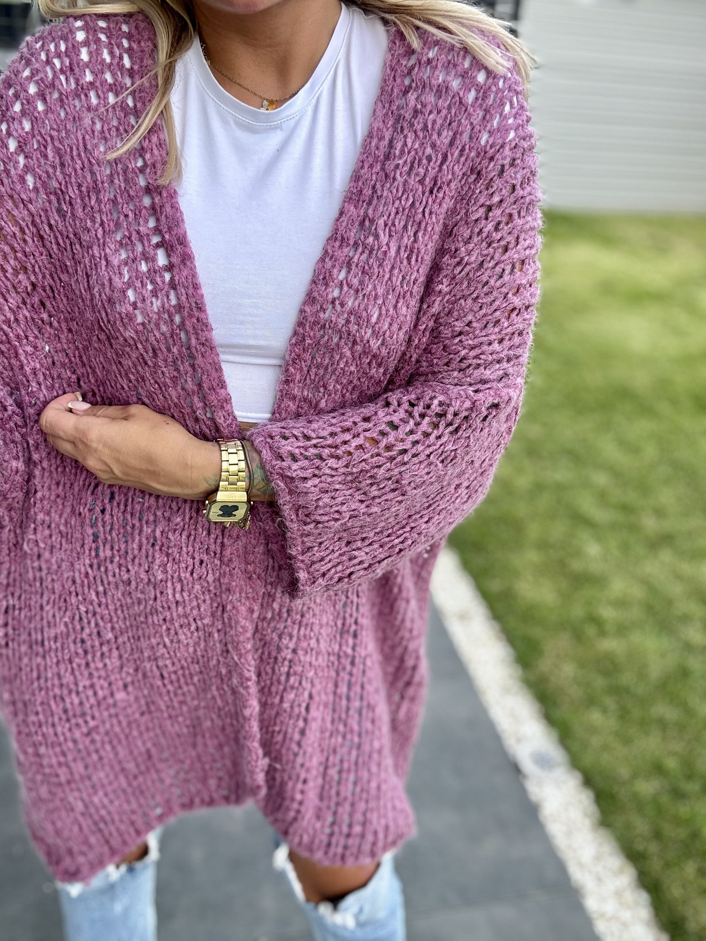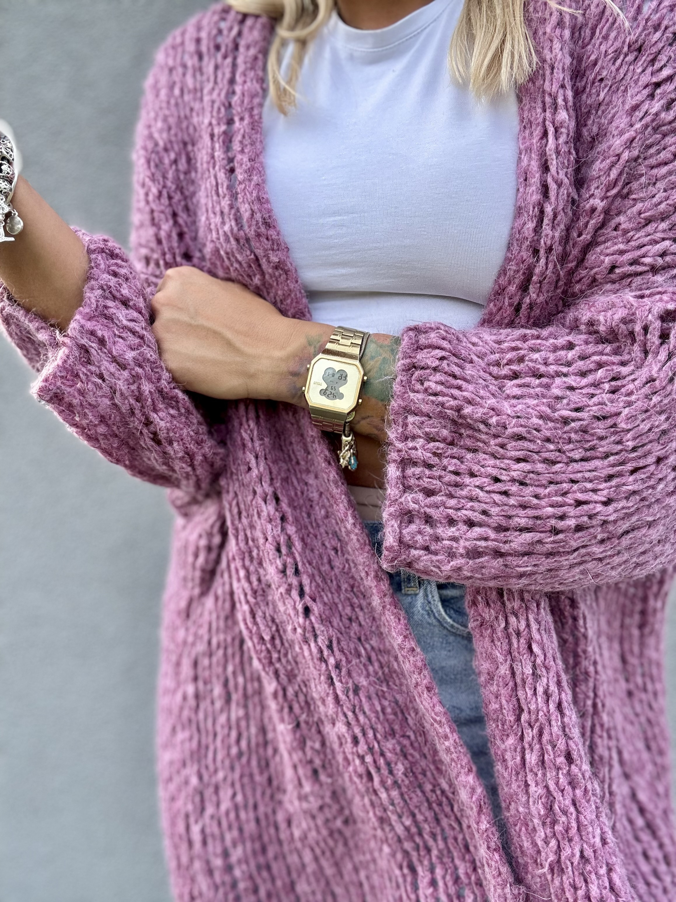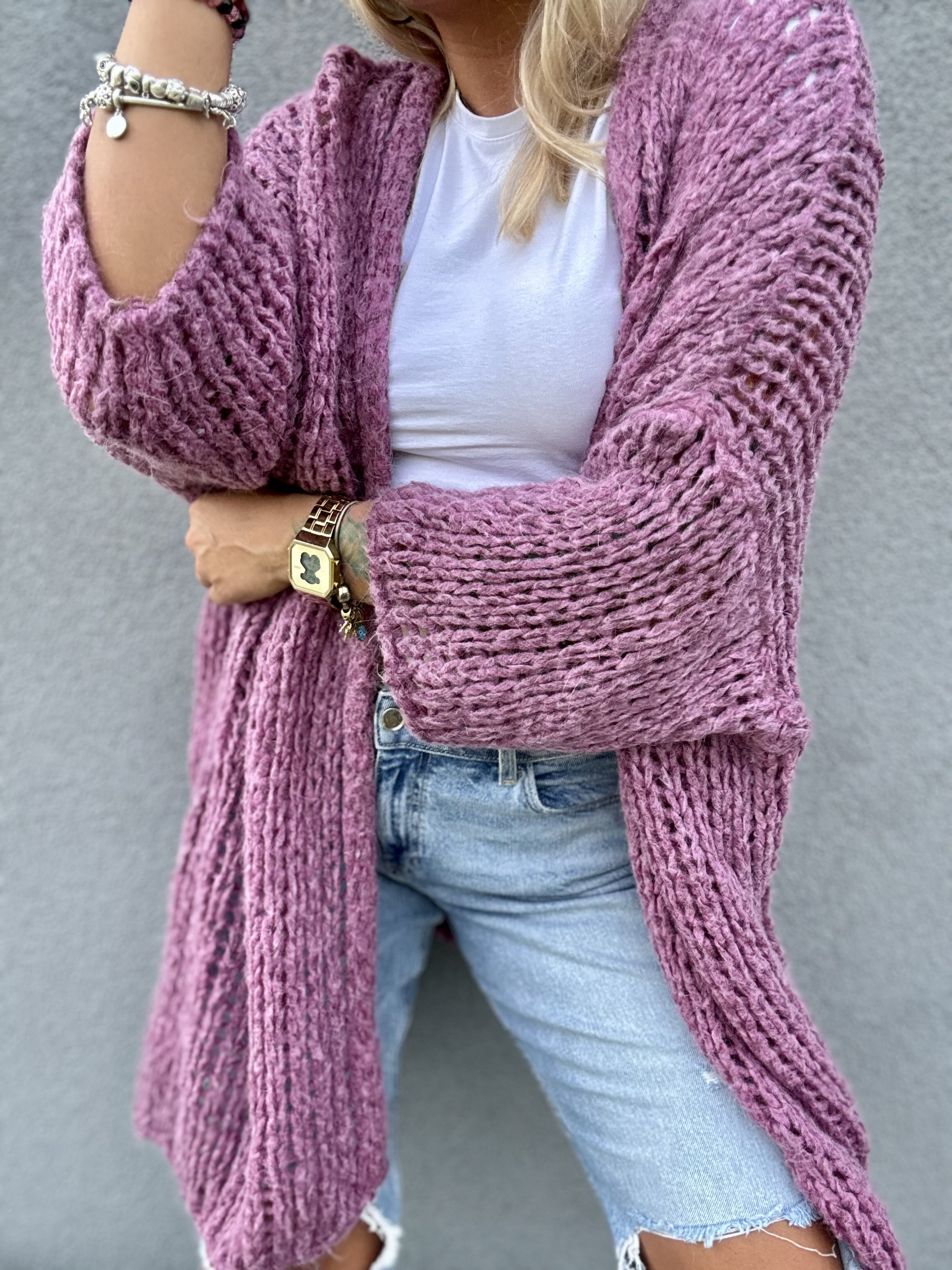 Kardigan damski bez zapięcia o luźnym splocie z moherem Mira - róż