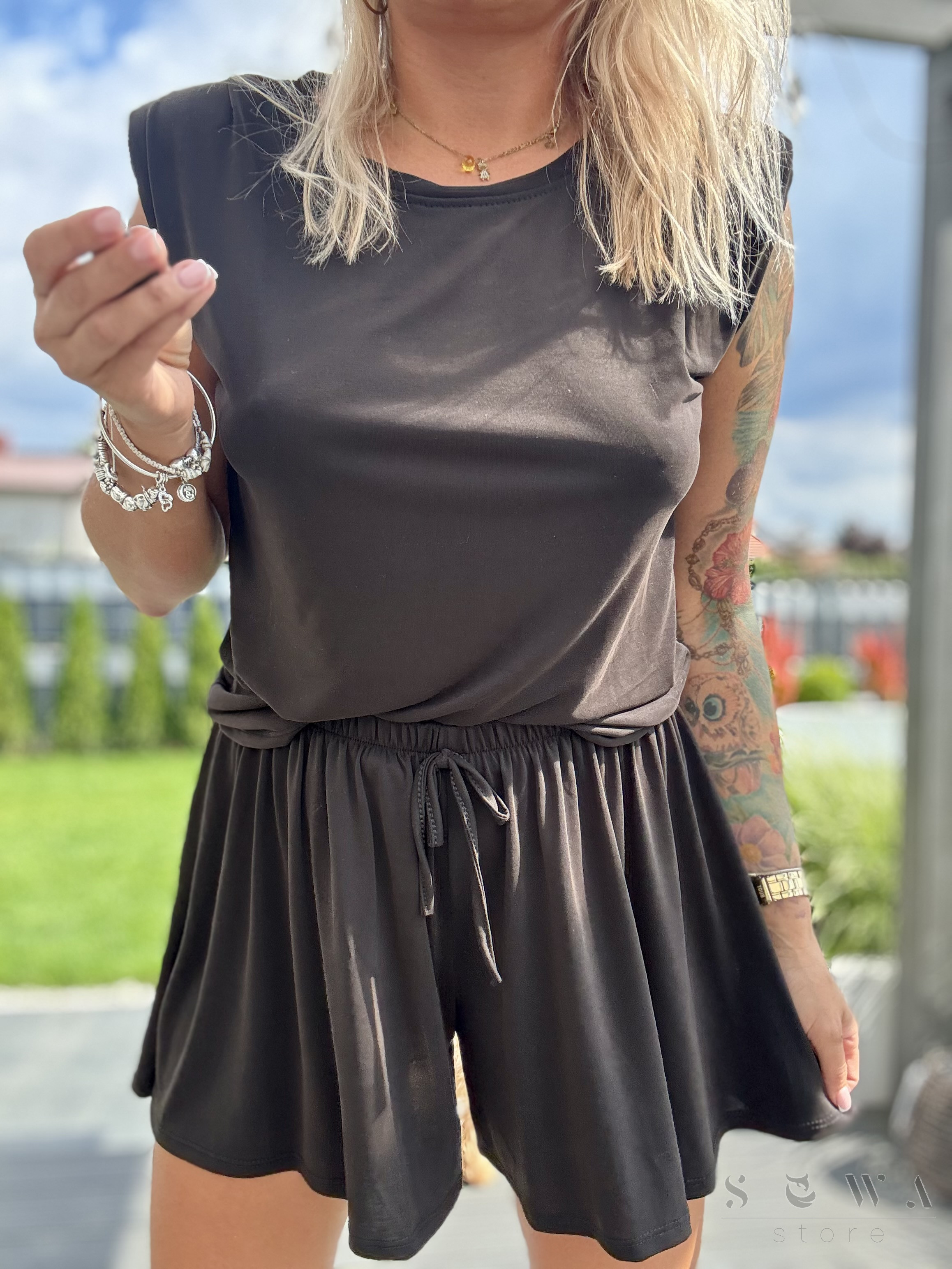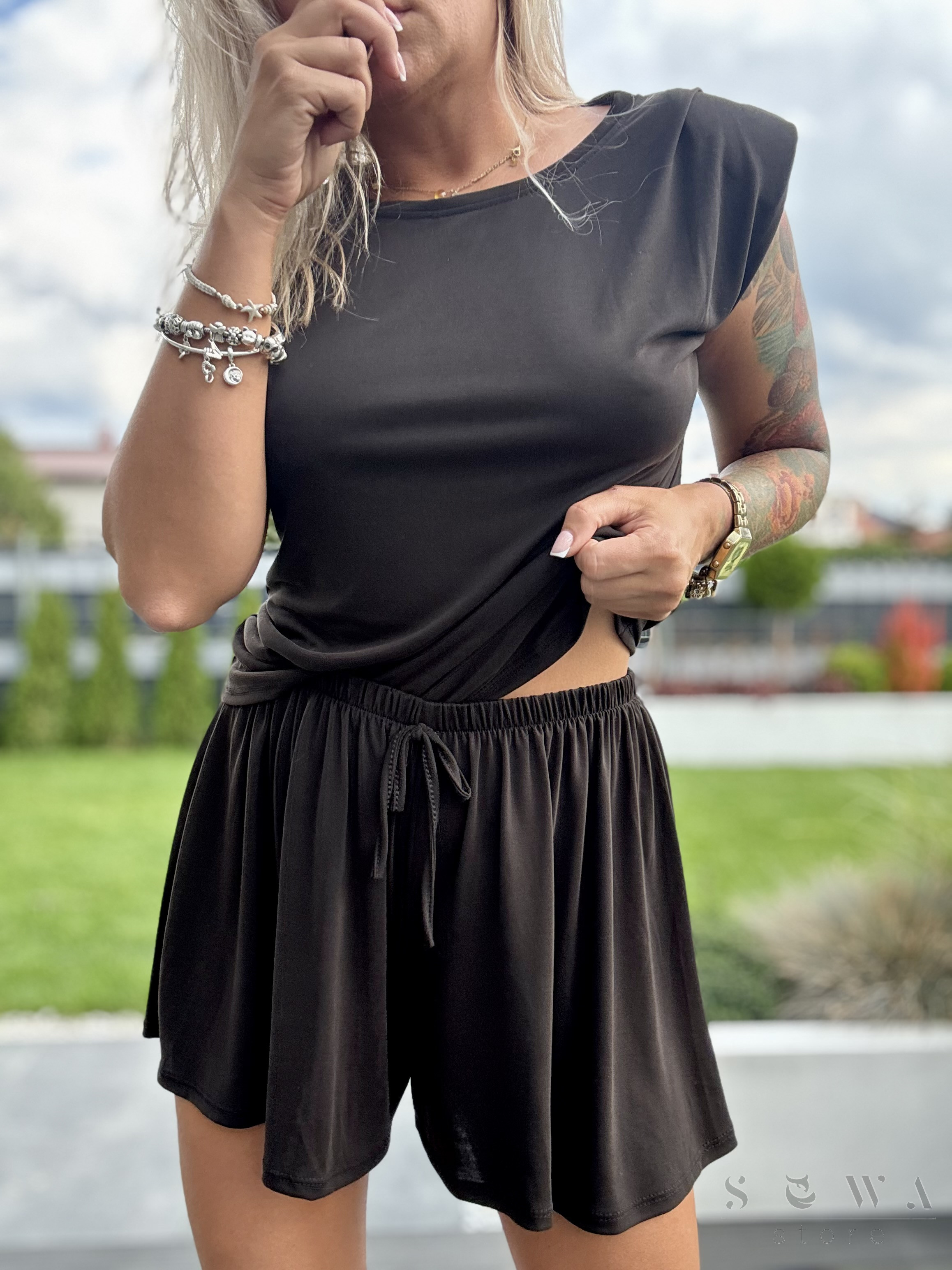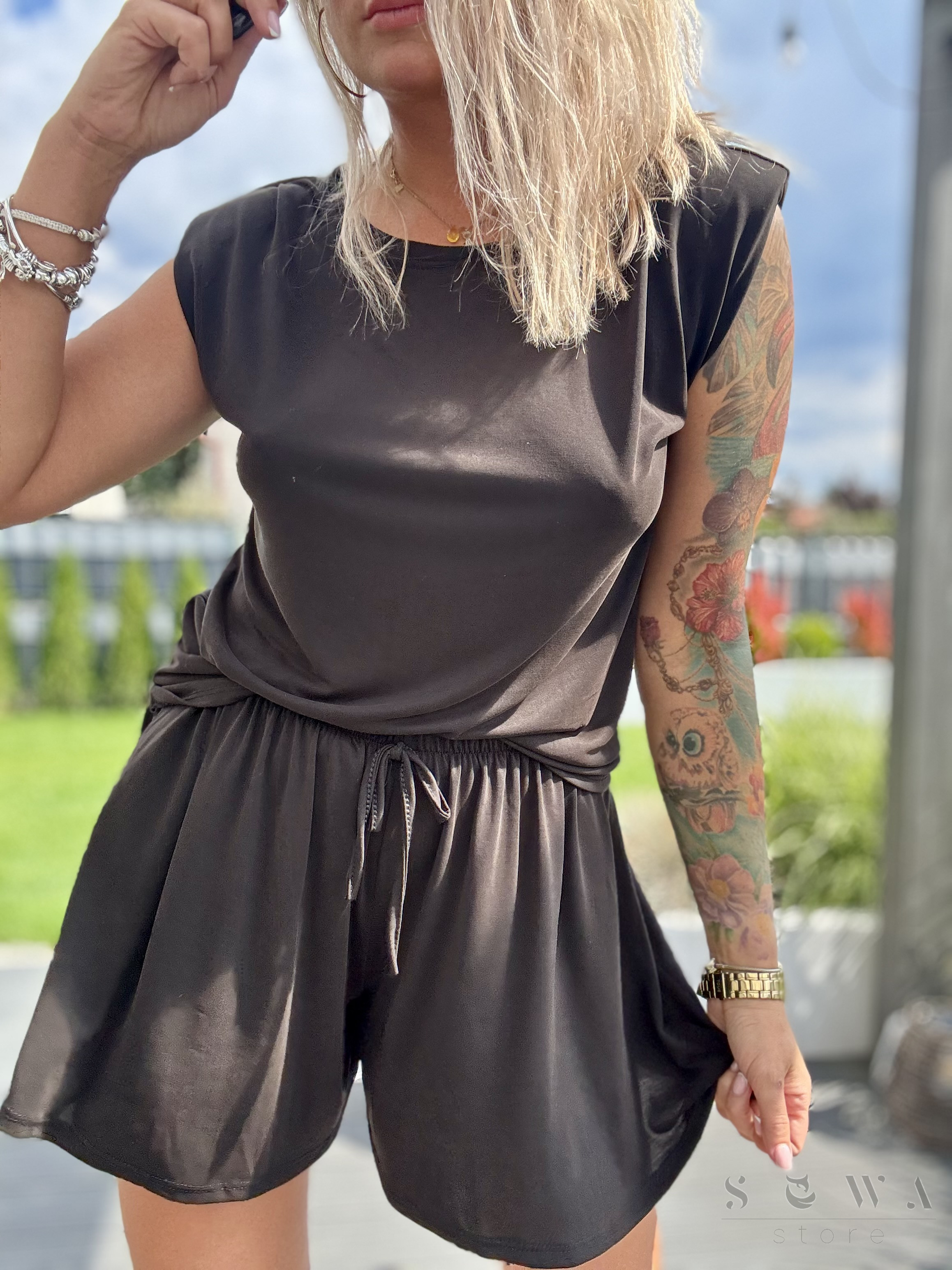 KOMPLET damski z wiskozy. Bluzka bez rękawów z poduszkami, luźne szorty z gumą w pasie i troczkiem. Idealny na wiosenne i letnie dni.