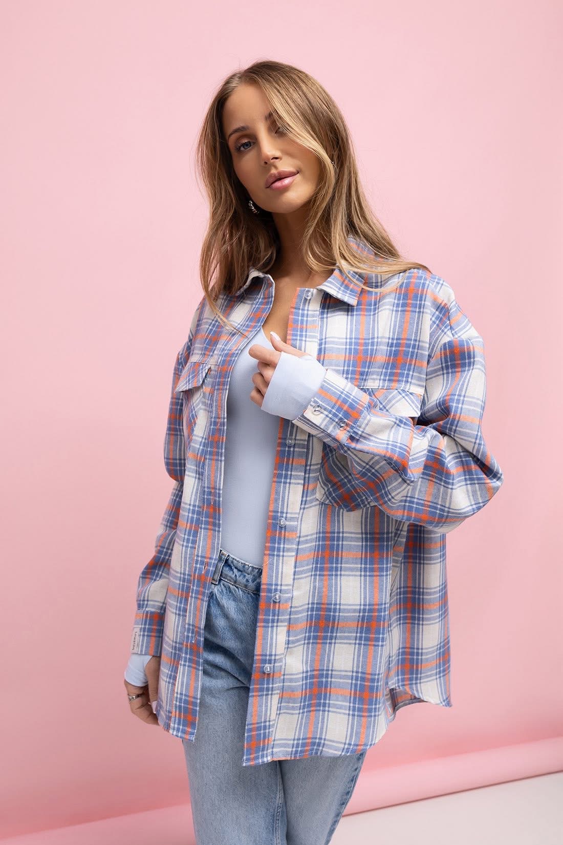 Koszula damska flanelowa w kratę Marry - niebieski/pomarancz