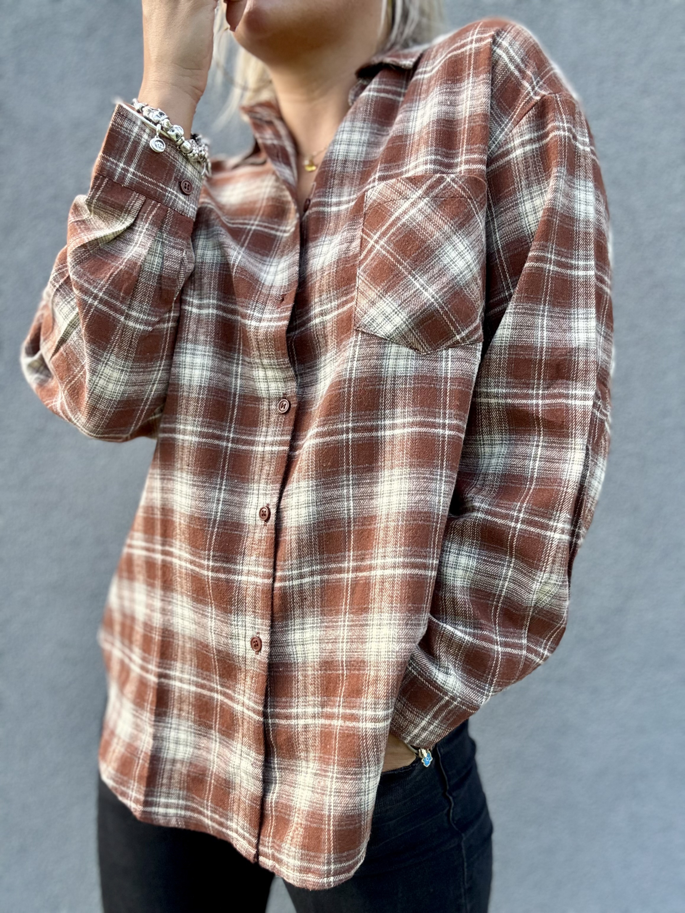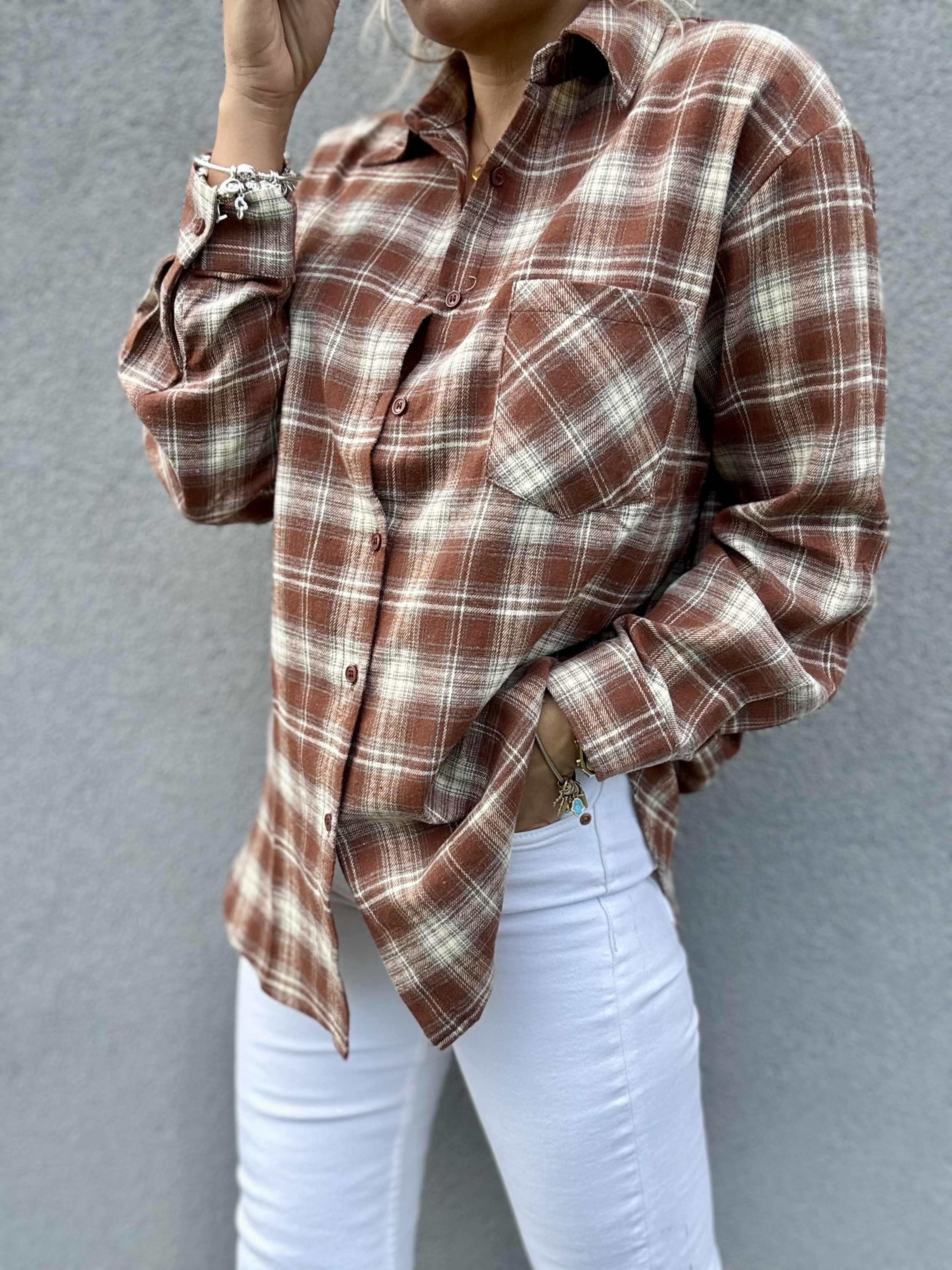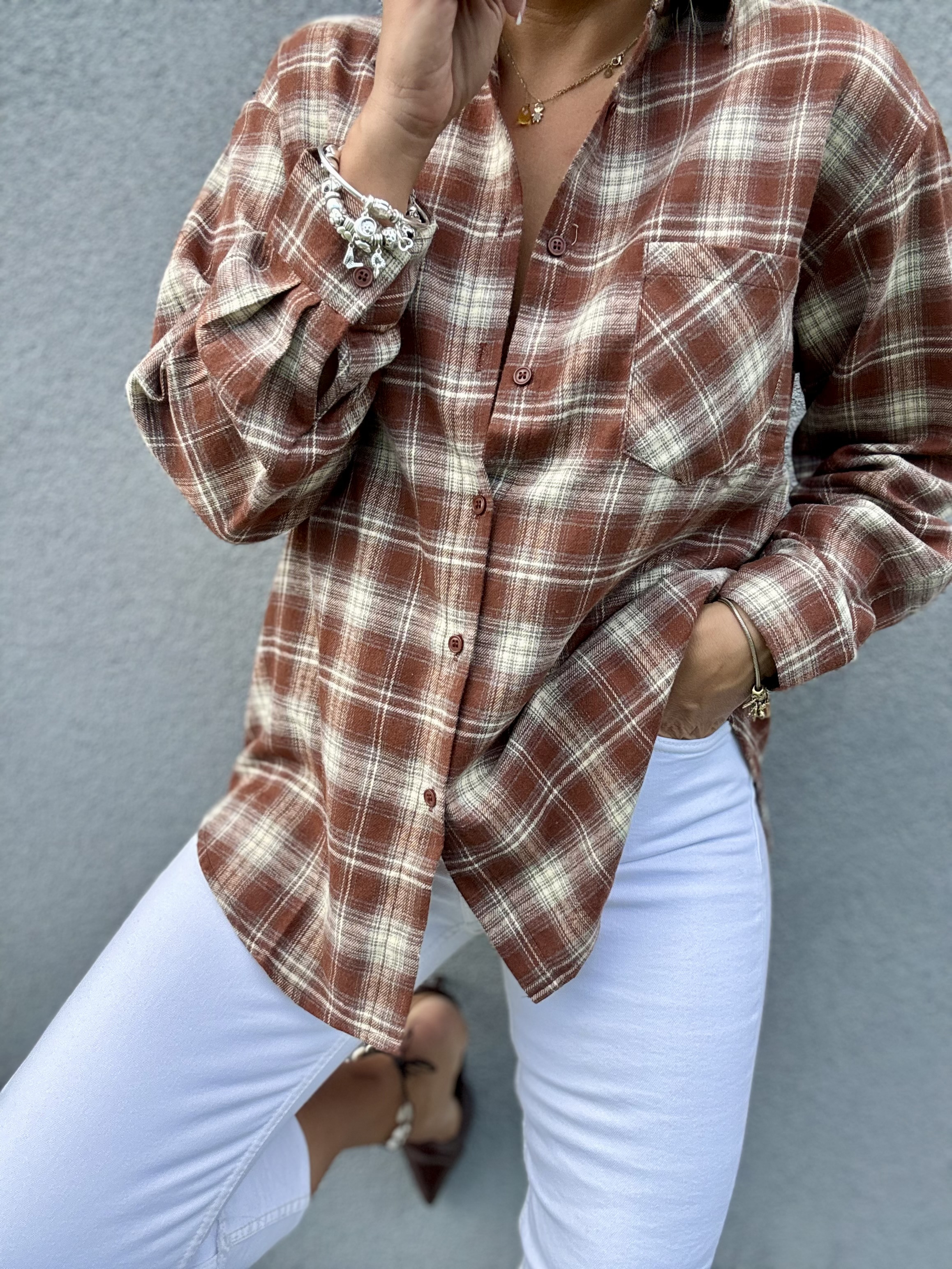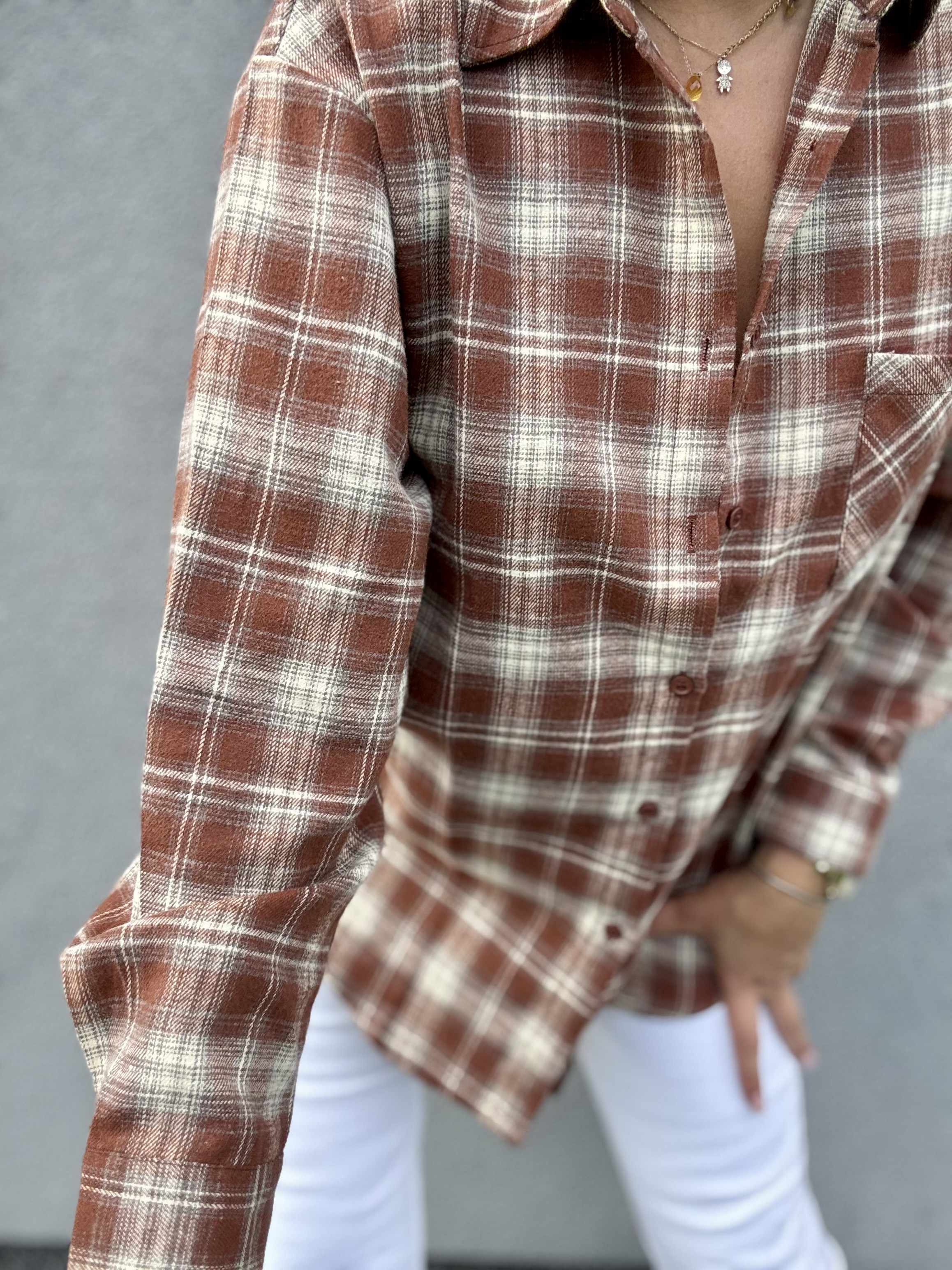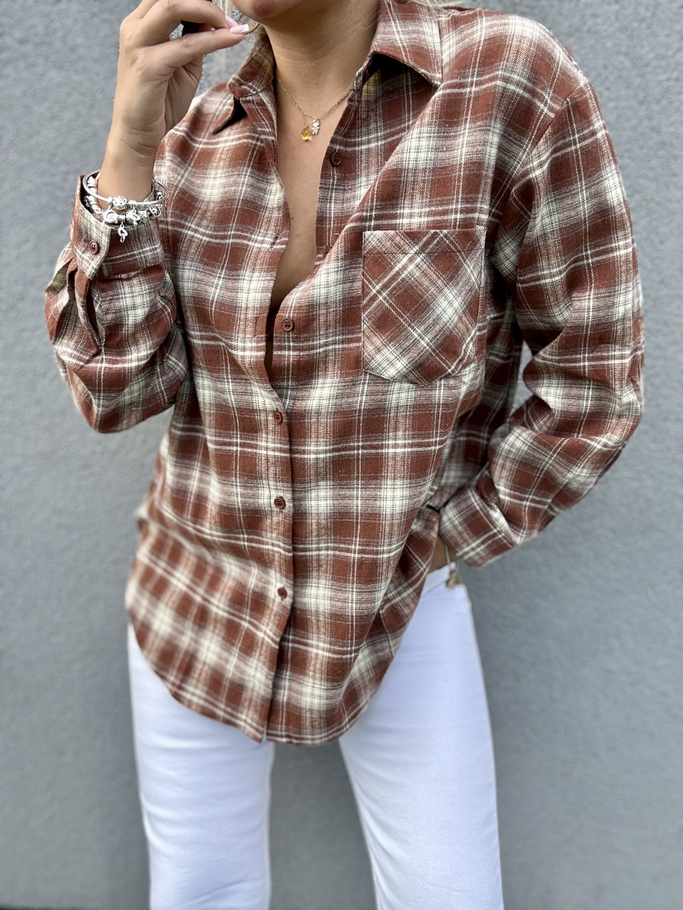 Koszula damska flanelowa w kratę z kieszenią Zuzia - brąz/biały/fango