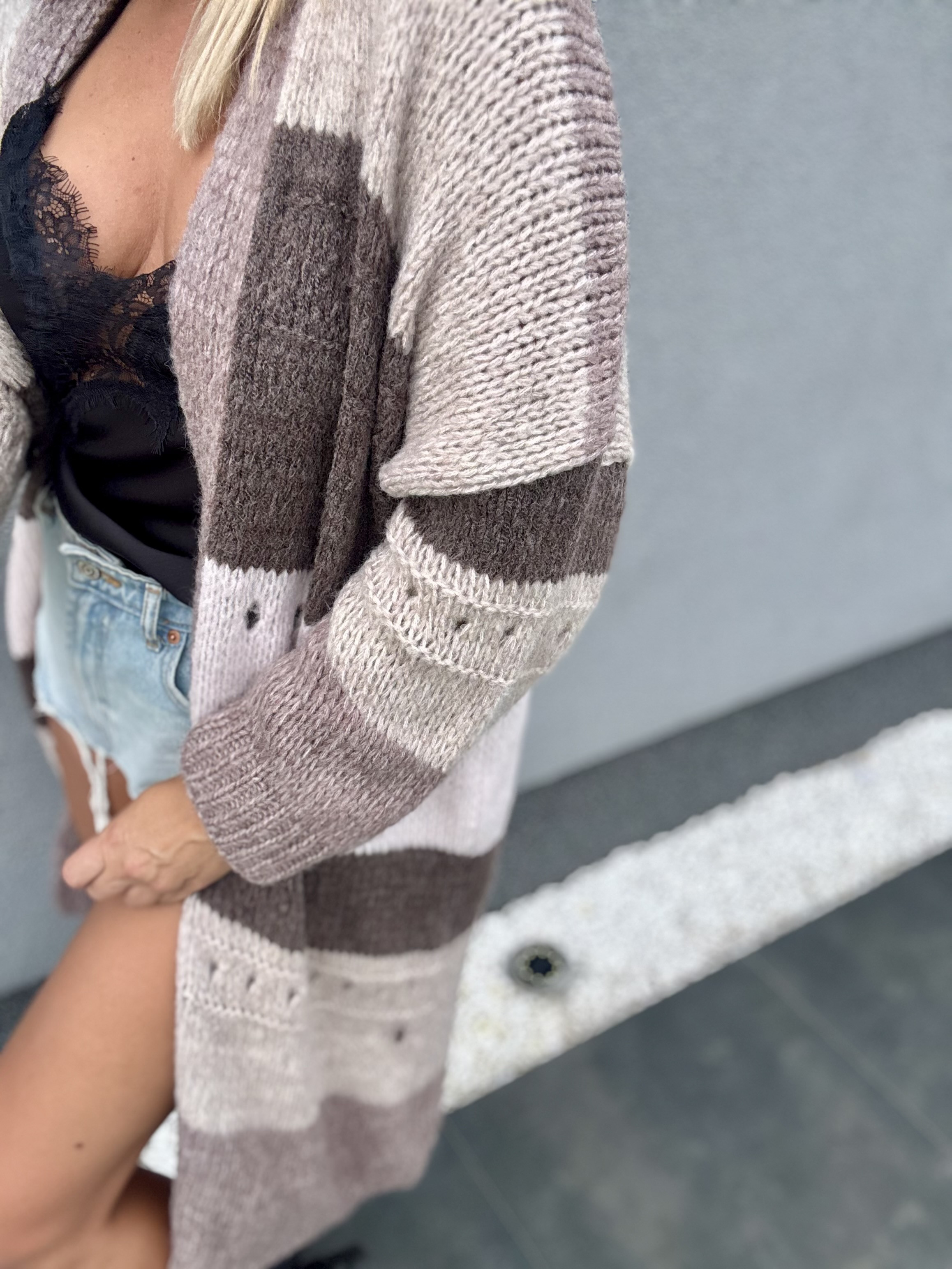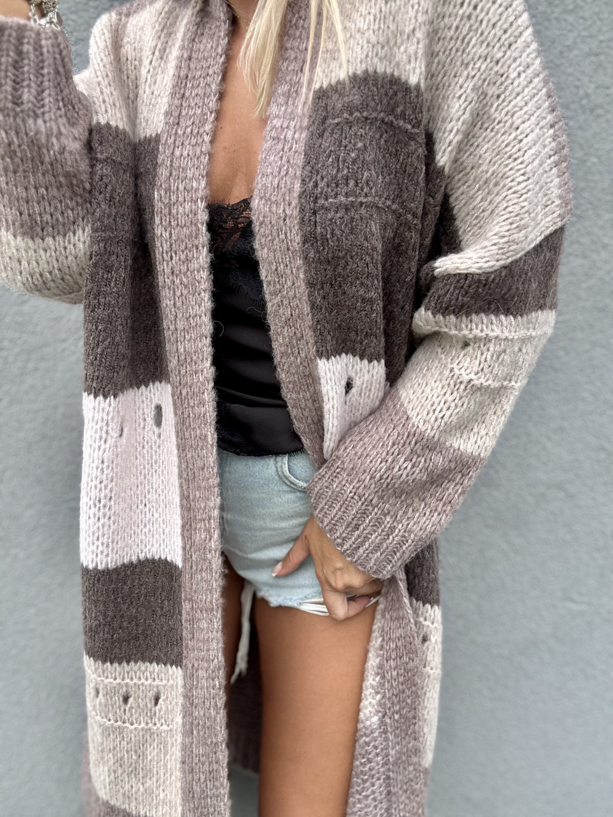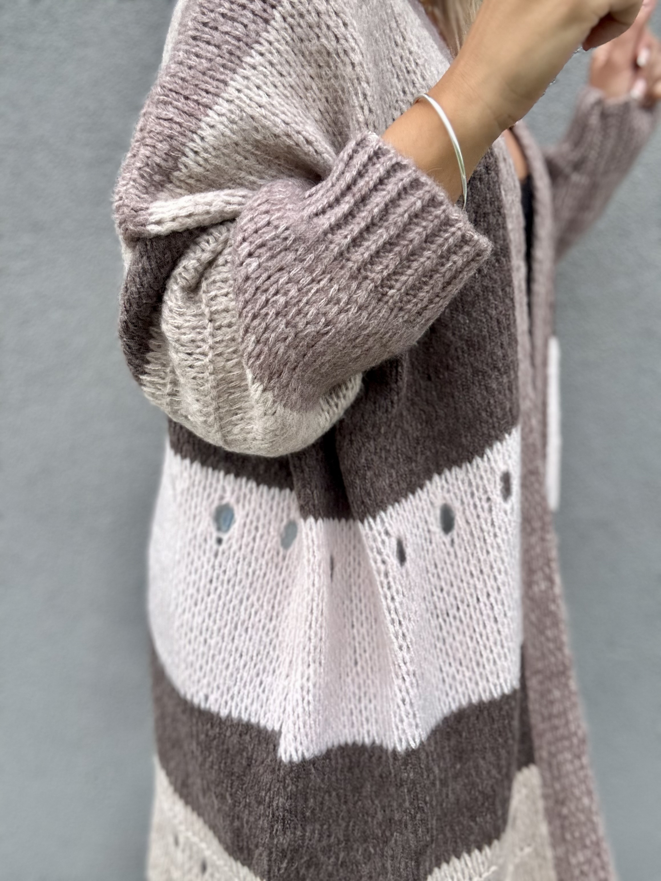 Sweter / kardigan damski ażurowy długi Kendall- czekolada/róż/fango